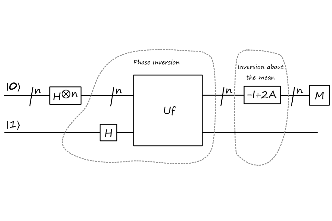 Combining phase inversion and inversion about the mean, we can create the circuit for Grover's algorithm: